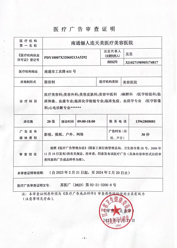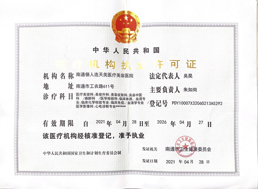 南通儷人連天美醫(yī)療美容醫(yī)院是與著名的醫(yī)療美容集團(tuán)合作建立的醫(yī)院,醫(yī)院提供高品質(zhì)的醫(yī)療美容服務(wù)。2008年,南通儷人連天美醫(yī)療美容醫(yī)院落戶南通,成為由南通衛(wèi)生局審批的專業(yè)醫(yī)療美容醫(yī)院。南通儷人連天美醫(yī)療美容醫(yī)院,特別設(shè)有專業(yè)的整形美容科、皮膚美容科和微創(chuàng)美容科三大科室,致力于為廣大求美者提供全方位的醫(yī)療美容服務(wù)。南通儷人連天美醫(yī)療美容醫(yī)院為求美者建立個(gè)人終生美麗檔案,一對一進(jìn)行細(xì)致服務(wù)。 11年來,南通儷人連天美醫(yī)療美容醫(yī)院,不斷引進(jìn)先進(jìn)設(shè)備,不斷完善醫(yī)美技術(shù),一批優(yōu)秀、專業(yè)而穩(wěn)定的醫(yī)生團(tuán)隊(duì),為無數(shù)求美者鑄就美麗夢想。